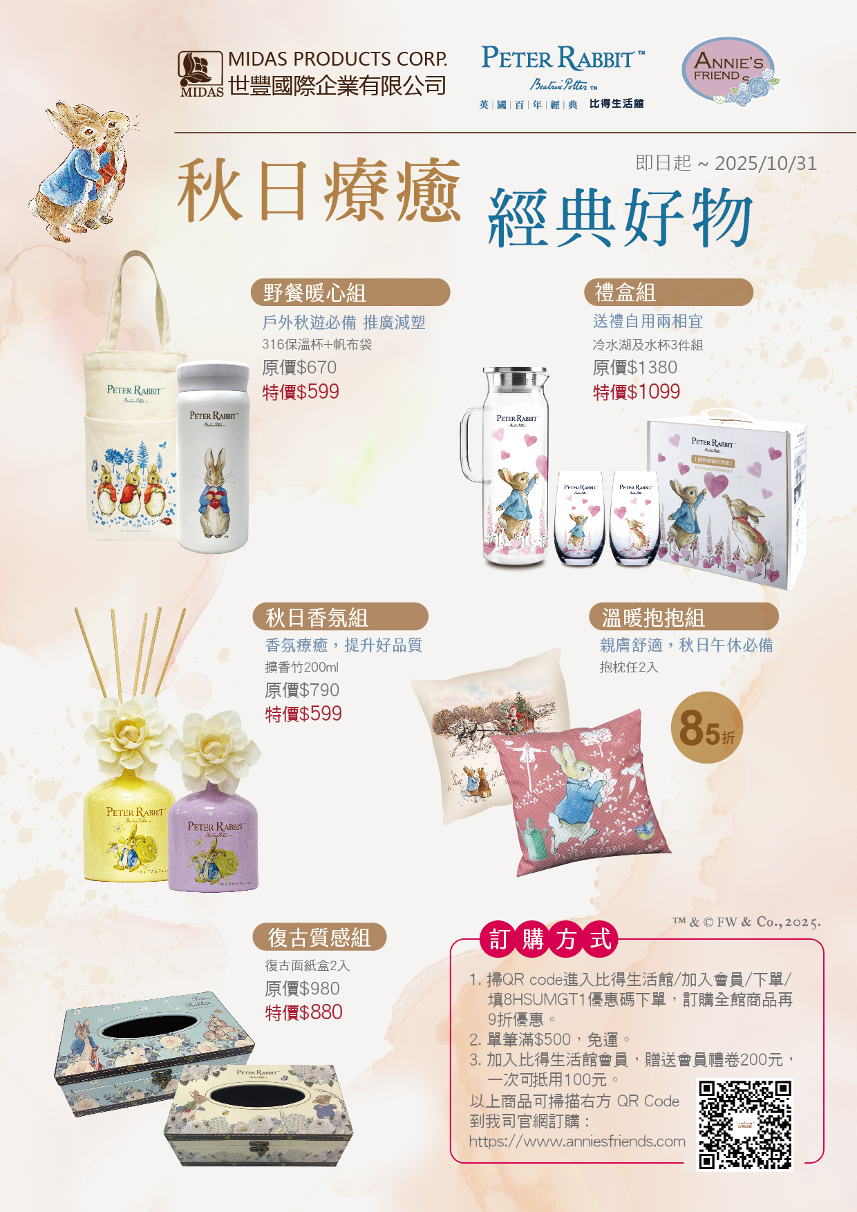 比得兔秋日療癒小物【優惠活動延長公告】感謝各位的支持與參與,世豐國際比得兔原訂9月之秋日優惠活動,因應廣大回響,特別延長活動時間至114/10/31。誠摯邀請您把握機會,享受超值優惠與精選好物。